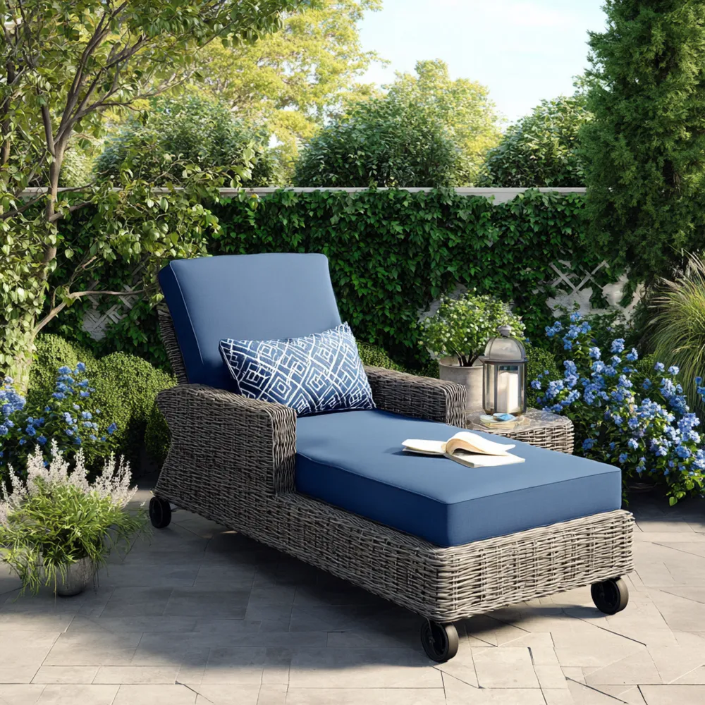 Fabriquée en résine tressée résistante aux intempéries, cette chaise longue est livrée avec des coussins confortables de couleur Bleue, parfaits pour un usage extérieur prolongé.